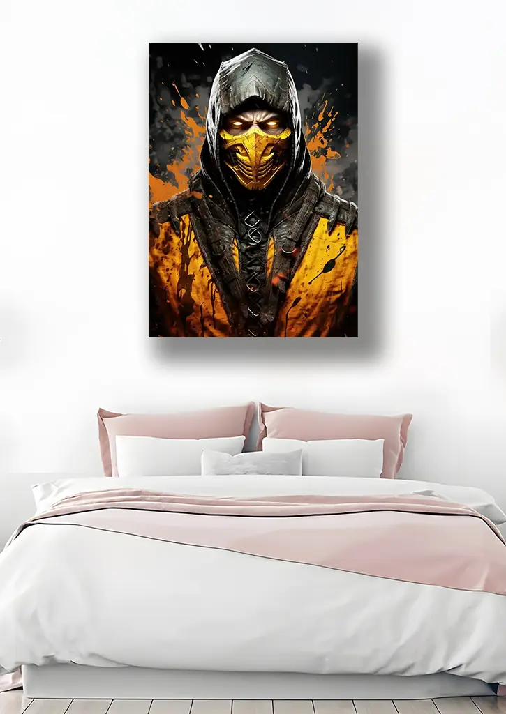 متال پوستر بازی Mortal Kombat طرح اسکورپیون تصویری جذاب و پرانرژی از جنگجوی افسانه‌ای این مجموعه را به نمایش می‌گذارد. در این طرح، اسکورپیون با چهره‌ای مصمم و زنجیر معروفش در میان شعله‌های آتش ایستاده است، نمادی از خشم، انتقام و قدرت مطلق. ترکیب رنگ‌های تیره و طلایی همراه با درخشش فلزی پوستر، جلوه‌ای خیره‌کننده ایجاد کرده و آن را به یکی از محبوب‌ترین انتخاب‌ها برای طرفداران این بازی تبدیل کرده است.