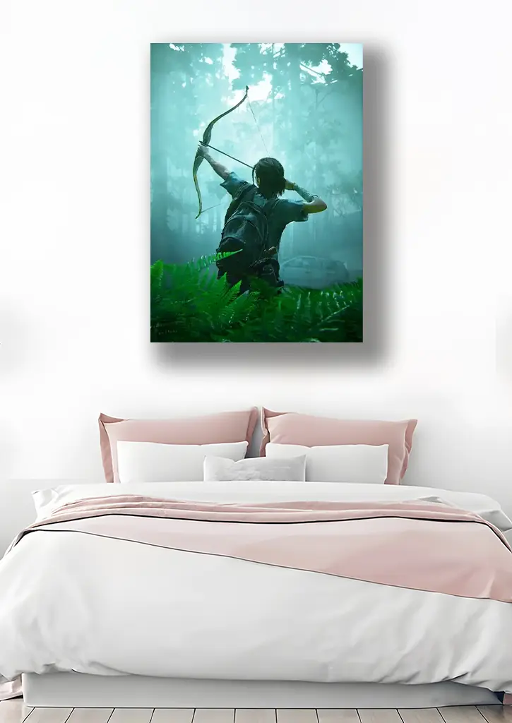 عکس متال پوستر بازی The Last of Us طرح الی با تیر و کمان تصویری پرتنش و هیجانانگیز از مهارت و شجاعت این شخصیت محبوب ارائه میدهد. در این اثر، الی در حال آمادهسازی تیر و کمان خود با نگاهی مصمم و متمرکز به هدف، حس بقا و هوش استراتژیک او را به خوبی منتقل میکند. پسزمینه تاریک و جزئیات دقیق لباس و تجهیزات، جلوهای واقعی و سینمایی به پوستر بخشیدهاند. این متال پوستر انتخابی عالی برای طرفداران The Last of Us است که میخواهند انرژی، هیجان و دنیای پرخطر بازی را در فضای اتاق یا گیمروم خود تجربه کنند.