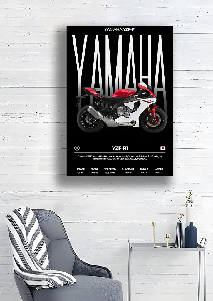 عکس متال پوستر طرح موتور یاماها YZF-R1 نمایانگر سرعت، قدرت و مهندسی پیشرفته این موتورسیکلت اسپرت است. در این طرح، YZF-R1 با جزئیات دقیق بدنه، چراغها و خطوط آیرودینامیک، در پسزمینهای پویا و هیجانانگیز قرار دارد که حس شتاب و انرژی بیپایان آن را منتقل میکند. رنگهای جذاب و انعکاس نور روی بدنه، جلوهای واقعی و سینمایی به پوستر بخشیدهاند. این متال پوستر انتخابی عالی برای علاقهمندان به موتورسیکلتهای اسپرت و دوستداران هیجان و سرعت است که میخواهند حضور Yamaha YZF-R1 را در فضای اتاق یا گیمروم خود زنده کنند.