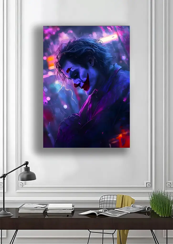 متال پوستر طرح جوکر تصویری تاریک، مرموز و پرانرژی از این ضدقهرمان نمادین را به نمایش میگذارد. در این طرح، جوکر با لبخندی هولناک و چشمانی نافذ در میان پسزمینهای پر از رنگهای تیره و افکتهای رنگارنگ دیده میشود، که حس جنون، هوش زیرکانه و بیرحمی او را منتقل میکند. جزئیات دقیق چهره، سایهها و طراحی پویا، جلوهای سینمایی و پرقدرت به پوستر بخشیدهاند. این متال پوستر انتخابی عالی برای طرفداران شخصیت جوکر و علاقهمندان به آثار تاریک و تاثیرگذار است.