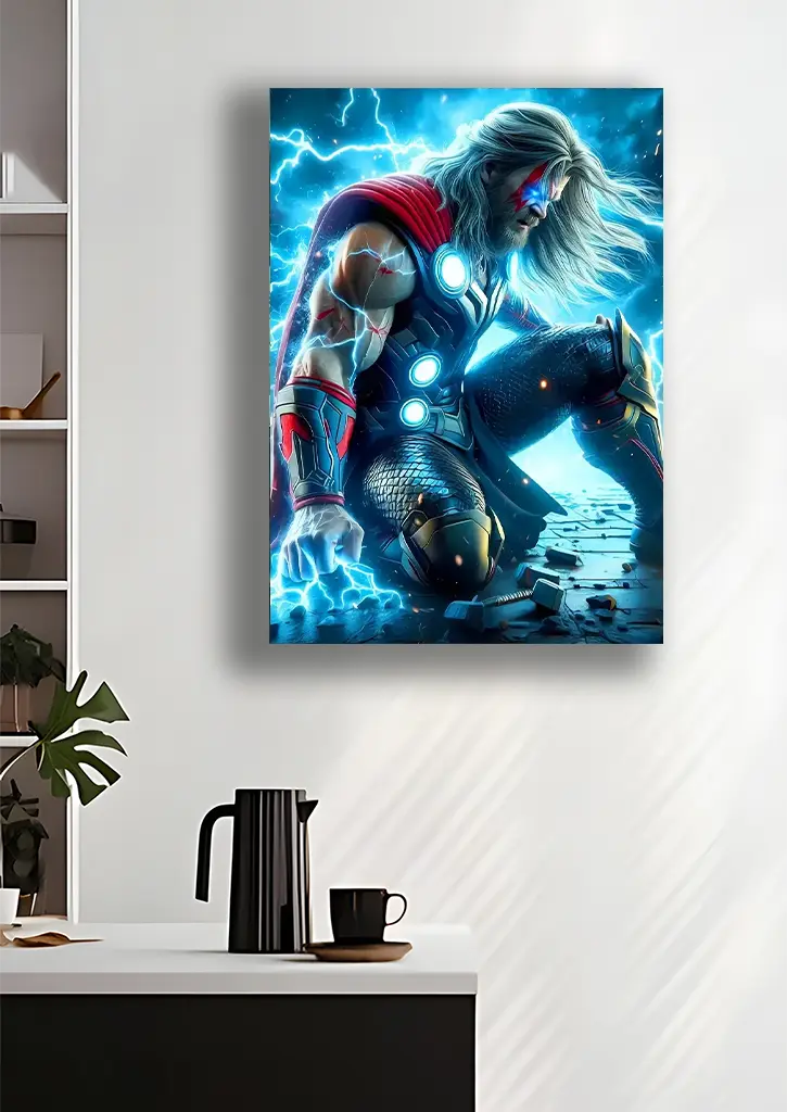 این متال پوستر با محوریت شخصیت Thor از دنیای سینمایی مارول طراحی شده است. تصویر ثور با چکش معروفش و حالت قهرمانانه، قدرت، شجاعت و عظمت خدای رعد را به‌خوبی نمایش می‌دهد. پس‌زمینه‌ی پوستر با افکت‌های رعد و رنگ‌های پویا، حس هیجان و انرژی نبردهای حماسی مارول را تقویت کرده و آن را به انتخابی ایده‌آل برای طرفداران ثور و کلکسیونرهای متال پوسترهای سینمایی تبدیل می‌کند.