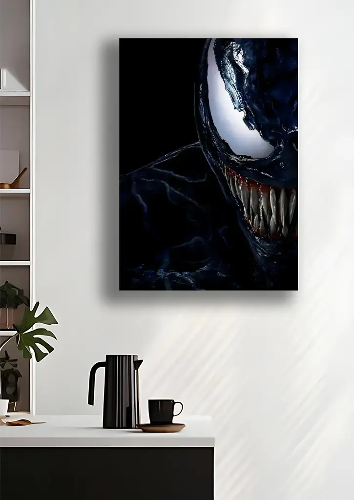 متال پوستر طرح ونوم تصویری تاریک، ترسناک و پرانرژی از این ضدقهرمان محبوب دنیای مارول را به نمایش میگذارد. در این طرح، ونوم با دندانهای تیز، زبان دراز و حالت تهدیدآمیز در پسزمینهای سایهدار و مرموز دیده میشود که حس وحشت، قدرت و خشونت کنترلنشده او را منتقل میکند. جزئیات دقیق بدن، بافت سمبیوت و افکتهای نورپردازی پویا، جلوهای سینمایی و جذاب به پوستر بخشیدهاند. این متال پوستر انتخابی ایدهآل برای طرفداران Venom و علاقهمندان به آثار تاریک و هیجانانگیز دنیای کمیک است.