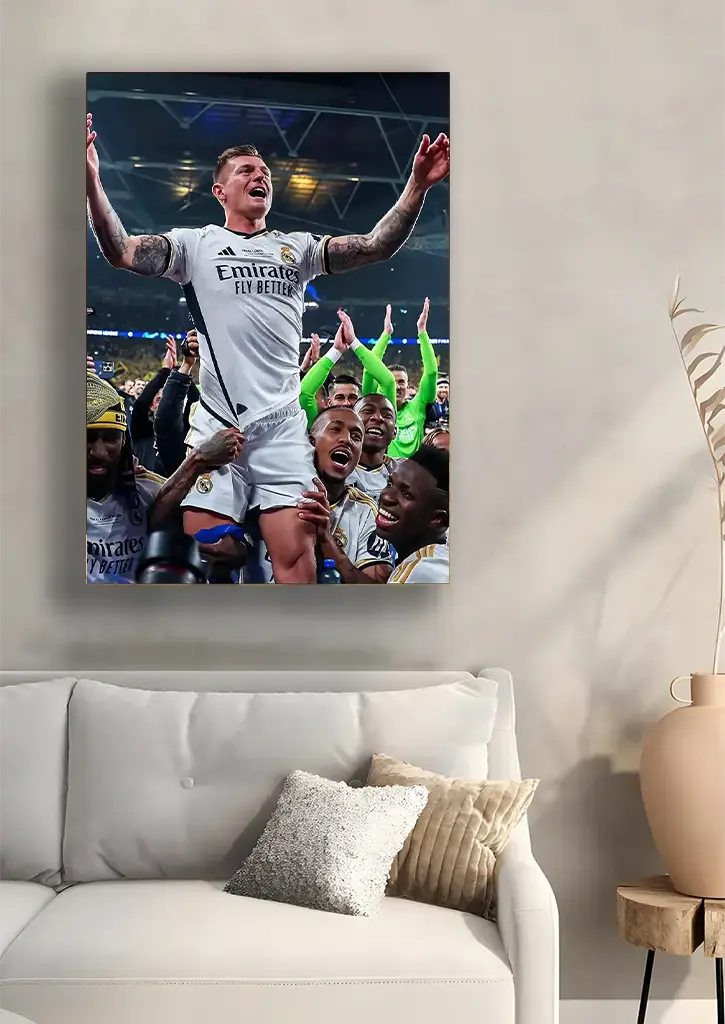 متال پوستر طرح تونی کروس تصویری پویا و الهامبخش از ستاره نامآشنای فوتبال جهان را به نمایش میگذارد. در این طرح، تونی کروس در حال کنترل توپ و هدایت بازی با تمرکز و مهارت بالا دیده میشود، که حس حرفهایگری، دقت و آرامش او در زمین فوتبال را منتقل میکند. جزئیات دقیق لباس تیم، حرکت بدن و افکتهای نورپردازی، جلوهای واقعگرایانه و جذاب به پوستر بخشیدهاند. این متال پوستر انتخابی ایدهآل برای طرفداران فوتبال و دوستداران بازیکنان برجسته و نمادهای ورزشی است.