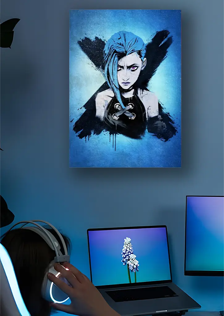 متال پوستر انیمه Arcane با طرح Jinx تصویری خیره‌کننده و پرانرژی از یکی از پیچیده‌ترین و محبوب‌ترین شخصیت‌های سریال را به نمایش می‌گذارد. در این طرح، جینکس با موهای آبی نئونی و اسلحه‌هایش در حال شیطنت و هرج‌ومرج دیده می‌شود که حس آزادی، شور و آشوب شخصیت او را منتقل می‌کند. جزئیات دقیق چهره، لباس و افکت‌های نورپردازی، جلوه‌ای سینمایی و واقع‌گرایانه به پوستر بخشیده‌اند. این متال پوستر انتخابی عالی برای طرفداران Arcane و علاقه‌مندان به شخصیت‌های کاریزماتیک، پرانرژی و پرهیجان دنیای انیمه و بازی است.