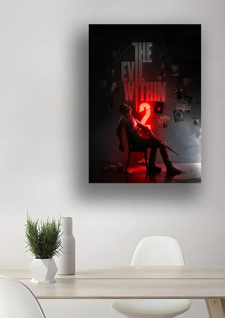 متال پوستر بازی The Evil Within یک اثر ترسناک و پرتنش است که دنیای تاریک و وحشتناک این بازی بقا و روان‌شناسانه را به تصویر می‌کشد. در این پوستر، شخصیت اصلی بازی در فضایی تاریک و پر از سایه‌های مخوف و موجودات تهدیدآمیز نمایش داده شده و جزئیات دقیق چهره، لباس و پس‌زمینه ترسناک، حس اضطراب، خطر و دلهره را به خوبی منتقل می‌کند. ترکیب رنگ‌های تیره با نورپردازی‌های متمرکز و مه‌آلود، جلوه‌ای سینمایی و ترسناک به پوستر بخشیده و آن را به انتخابی ایده‌آل برای طرفداران بازی‌های وحشت و دکوراسیون دیوارهای هیجان‌انگیز تبدیل کرده است.
