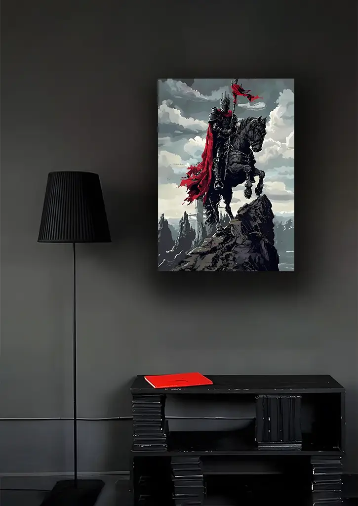 متال پوستر بازی Dark Souls یک اثر تاریک و حماسی است که دنیای پرچالش و مرموز این بازی را به تصویر می‌کشد. در این پوستر، شخصیت اصلی بازی با زره و شمشیر در حال آماده شدن برای نبرد با دشمنان قدرتمند و غول‌آسا نمایش داده شده و جزئیات دقیق زره، سلاح‌ها و پس‌زمینه سایه‌دار و مه‌آلود، حس خطر، شجاعت و استقامت را به خوبی منتقل می‌کند. ترکیب رنگ‌های تیره و نورپردازی‌های استراتژیک، جلوه‌ای سینمایی و پرانرژی به پوستر بخشیده و آن را به انتخابی ایده‌آل برای طرفداران بازی‌های ویدیویی و دنیای Dark Souls تبدیل کرده است.