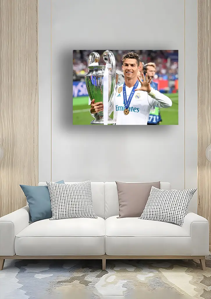 متال پوستر کریستیانو رونالدو با عدد 5 یک اثر الهامبخش و پرانرژی است که لحظه تاریخی و پرافتخار کسب پنج قهرمانی لیگ قهرمانان اروپا توسط او را به تصویر میکشد. در این پوستر، رونالدو با حالت پیروزمند و پیراهن تیمش، عدد ۵ را به شکل نمادین نشان میدهد و جزئیات دقیق چهره، لباس و پسزمینه هیجانانگیز، حس غرور، قدرت و موفقیت او را به خوبی منتقل میکند. ترکیب رنگهای زنده و نورپردازیهای پویا، جلوهای چشمنواز و هیجانانگیز به پوستر بخشیده و آن را به انتخابی ایدهآل برای طرفداران فوتبال و هواداران کریستیانو رونالدو تبدیل کرده است.
