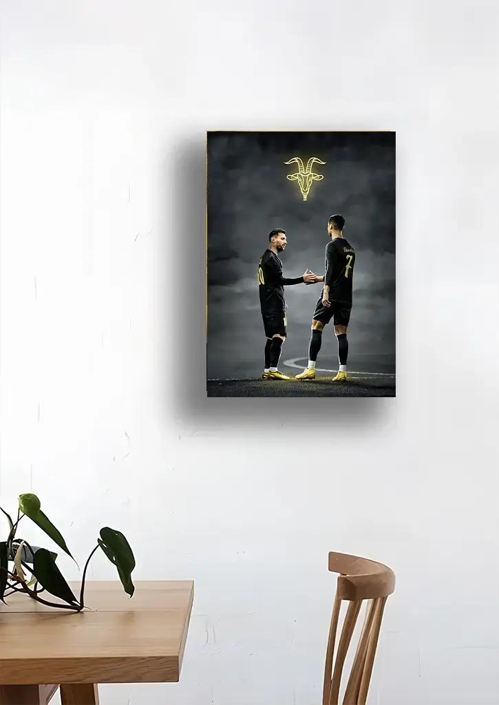 متال پوستر طرح کریستیانو رونالدو و لیونل مسی که دست می‌دهند یک اثر نمادین و الهام‌بخش است که لحظه دوستی و احترام بین دو اسطوره فوتبال را به تصویر می‌کشد. در این پوستر، رونالدو و مسی با حالت مصمم و احترام‌آمیز در حال دست دادن نمایش داده شده و جزئیات دقیق چهره، لباس تیم‌ها و پس‌زمینه پویا، حس هم‌بستگی، حرفه‌ای‌گری و رقابت سالم را به خوبی منتقل می‌کند. ترکیب رنگ‌های زنده و نورپردازی‌های متمرکز، جلوه‌ای جذاب و پرانرژی به پوستر بخشیده و آن را به انتخابی ایده‌آل برای علاقه‌مندان به فوتبال و دکوراسیون دیوارهای الهام‌بخش تبدیل کرده است.