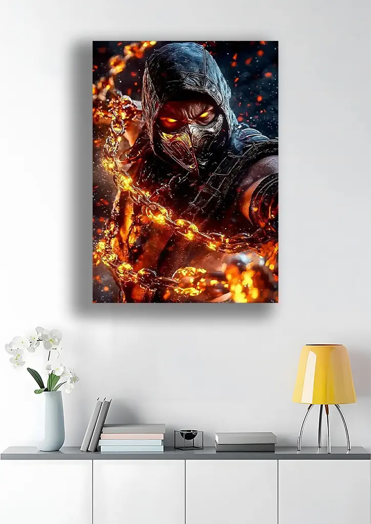 متال پوستر بازی Mortal Kombat طرح اسکورپیون با فضایی آتشین، تهاجمی و خیره‌کننده، یکی از نمادین‌ترین مبارزان این سری را به شکلی چشمگیر نمایش می‌دهد. در این تصویر، اسکورپیون با ماسک طلایی، زره تیره و نگاه مصممش، درست در میان شعله‌ها یا هاله‌ای از انرژی سوزان قرار گرفته و حس انتقام‌جویی و قدرت بی‌رحمانه‌اش را منتقل می‌کند. بافت فلزی پوستر باعث می‌شود جزئیات زره، انعکاس آتش و خطوط پویا روشن‌تر و برجسته‌تر دیده شوند و طرح جلوه‌ای سه‌بعدی و بسیار حرفه‌ای پیدا کند. این پوستر انتخابی عالی برای طرفداران Mortal Kombat و عاشقان شخصیت افسانه‌ای اسکورپیون است که می‌خواهند فضای خود را با تصویری پرقدرت و آتشین تزئین کنند.