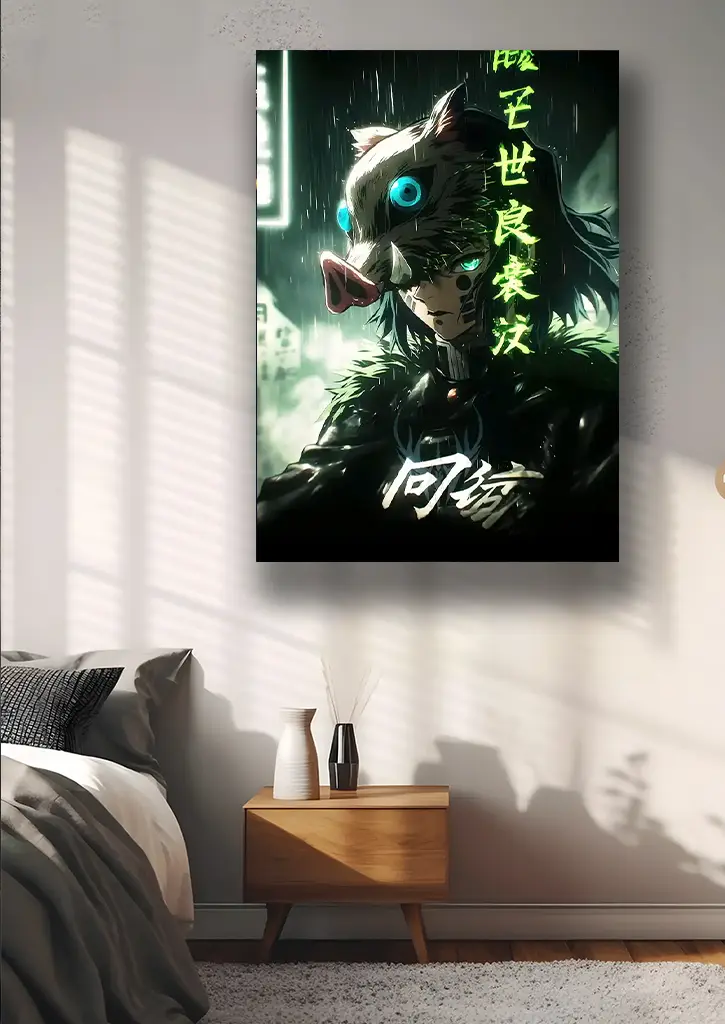 متال پوستر انیمه شیطانکش طرح اینوسکه تصویری پرانرژی، خشن و جذاب از یکی از شخصیتهای سرسخت و محبوب این انیمه ارائه میدهد. در این طرح، اینوسکه با ماسک حیوانی و ژست رزمی پرانرژی، شجاعت، مهارت رزمی و طبیعت سرسخت او را بهخوبی منتقل میکند. پسزمینه پوستر با رنگهای تیره و افکتهای پویا، حرکت و انرژی شخصیت را برجسته کرده و بافت فلزی باعث میشود جزئیات ماسک، لباس و خطوط حرکتی به شکل سهبعدی و چشمگیر دیده شوند. این پوستر انتخابی عالی برای طرفداران Demon Slayer است که میخواهند فضایی پرقدرت، هیجانانگیز و خشن به دکور خود اضافه کنند.
