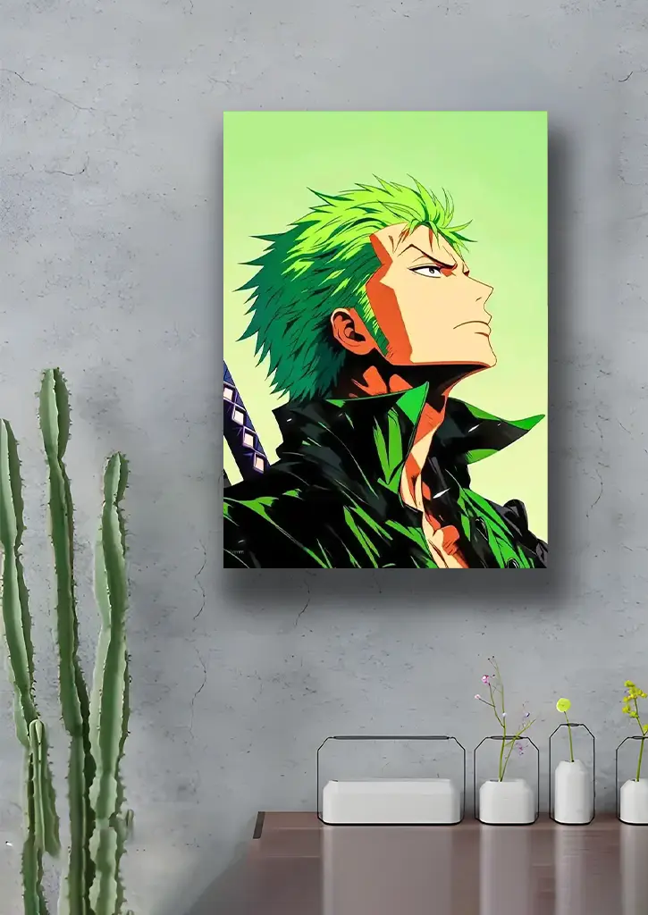 متال پوستر انیمه وان پیس طرح زورو تصویری پرانرژی و هیجان‌انگیز از شمشیرزن ماهر و محبوب این انیمه ارائه می‌دهد. در این طرح، زورو با سه شمشیر خود در حالت رزمی و نگاه مصمم دیده می‌شود که حس قدرت، مهارت و اراده استوار او را به‌خوبی منتقل می‌کند. پس‌زمینه پوستر با افکت‌های حرکتی و رنگ‌های تیره و پویا، جنبش و انرژی شخصیت را برجسته کرده و بافت فلزی باعث می‌شود جزئیات لباس، شمشیرها و خطوط حرکتی به شکل سه‌بعدی و چشمگیر دیده شوند. این پوستر انتخابی عالی برای طرفداران وان پیس است که می‌خواهند فضایی پرهیجان، قهرمانانه و قدرتمند به دکور خود اضافه کنند.