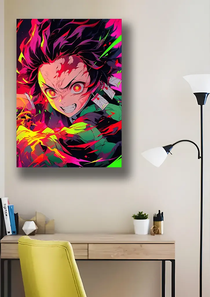 متال پوستر انیمه شیطانکش طرح تانجیرو تصویری پرانرژی، هیجانانگیز و الهامبخش از شخصیت اصلی این انیمه ارائه میدهد. در این طرح، تانجیرو کامادو با شمشیر خود در حالت آمادهبهنبرد و با نگاه مصمم دیده میشود که حس شجاعت، اراده و عزم راسخ او را بهخوبی منتقل میکند. پسزمینه با افکتهای پویا، رنگهای زنده و هالههای انرژی، حرکت و جذابیت شخصیت را برجسته کرده و بافت فلزی باعث میشود جزئیات لباس، خطوط حرکتی و حالت چهره به شکل سهبعدی و چشمگیر دیده شوند. این پوستر انتخابی عالی برای طرفداران Demon Slayer است که میخواهند فضایی هیجانانگیز، قدرتمند و الهامبخش به دکور خود اضافه کنند.