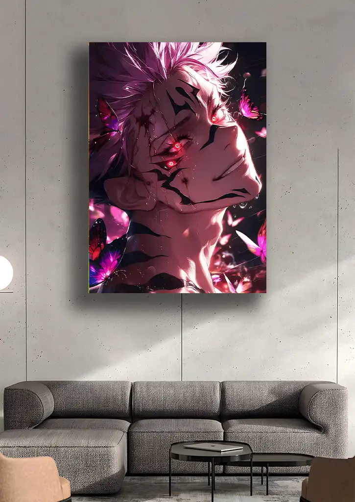 متال پوستر انیمه جوجوتسو کایسن طرح سوکونا با نمایش چهره ترسناک و شیطانی این شخصیت افسانه‌ای، فضایی تاریک، مرموز و پرقدرت ایجاد می‌کند. در این طراحی، سوکونا با لبخند شیطانی و چشمان نافذ خود در میان سایه‌ها و افکت‌های قرمز و تیره به تصویر کشیده شده و حس خطر، قدرت بی‌رحمانه و هراس‌آور او را منتقل می‌کند. رنگ‌بندی تیره همراه با سطح براق متال باعث می‌شود جزئیات خالکوبی‌ها، حالت حرکات و افکت‌های انرژی به شکلی برجسته و چشم‌نواز دیده شوند. این پوستر انتخابی عالی برای طرفداران جوجوتسو کایسن و کسانی است که به دنبال یک اثر قدرتمند، ترسناک و تاثیرگذار برای دکور اتاق یا محل بازی خود هستند.