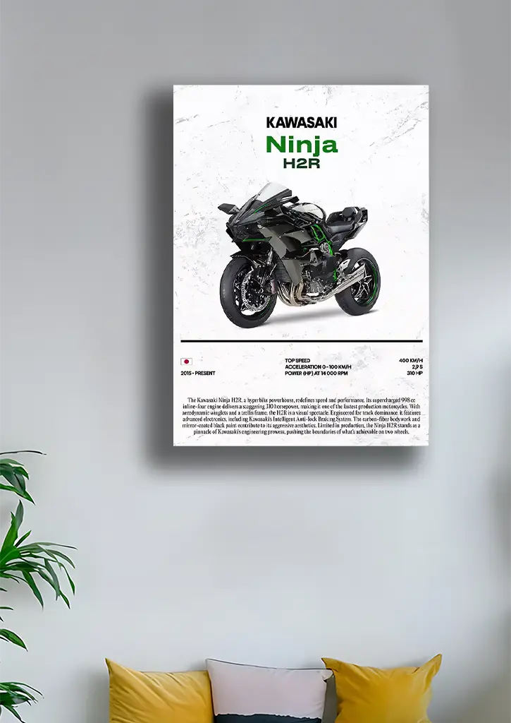 این متال پوستر با طرح موتور Kawasaki Ninja H2R، قدرت، سرعت و طراحی خشن این موتور اسپرت را با جزئیات دقیق و جلوهای پویا به تصویر میکشد. خطوط بدنه، زوایای تهاجمی و انعکاس نور روی سطح موتور، حس هیجان و آدرنالین واقعی رانندگی با یک هیولای سرعت را منتقل میکند. کیفیت بالای متال باعث دوام و ماندگاری طولانیمدت پوستر شده و جلوهای مدرن و اسپرت به دکور اتاق، گاراژ یا محل کار اضافه میکند. این پوستر انتخابی بینظیر برای علاقهمندان به موتورسواری، طرفداران Kawasaki و کلکسیونرهایی است که به دنبال یک اثر هنری متفاوت و پرانرژی هستند.